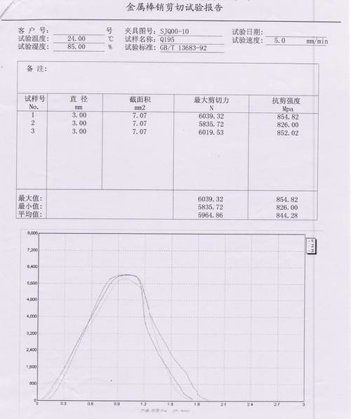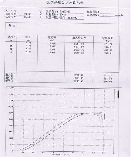 6061鋁金屬棒銷剪切試驗報告內容:①直徑 截面積 ②最大剪切力 ③抗剪強度